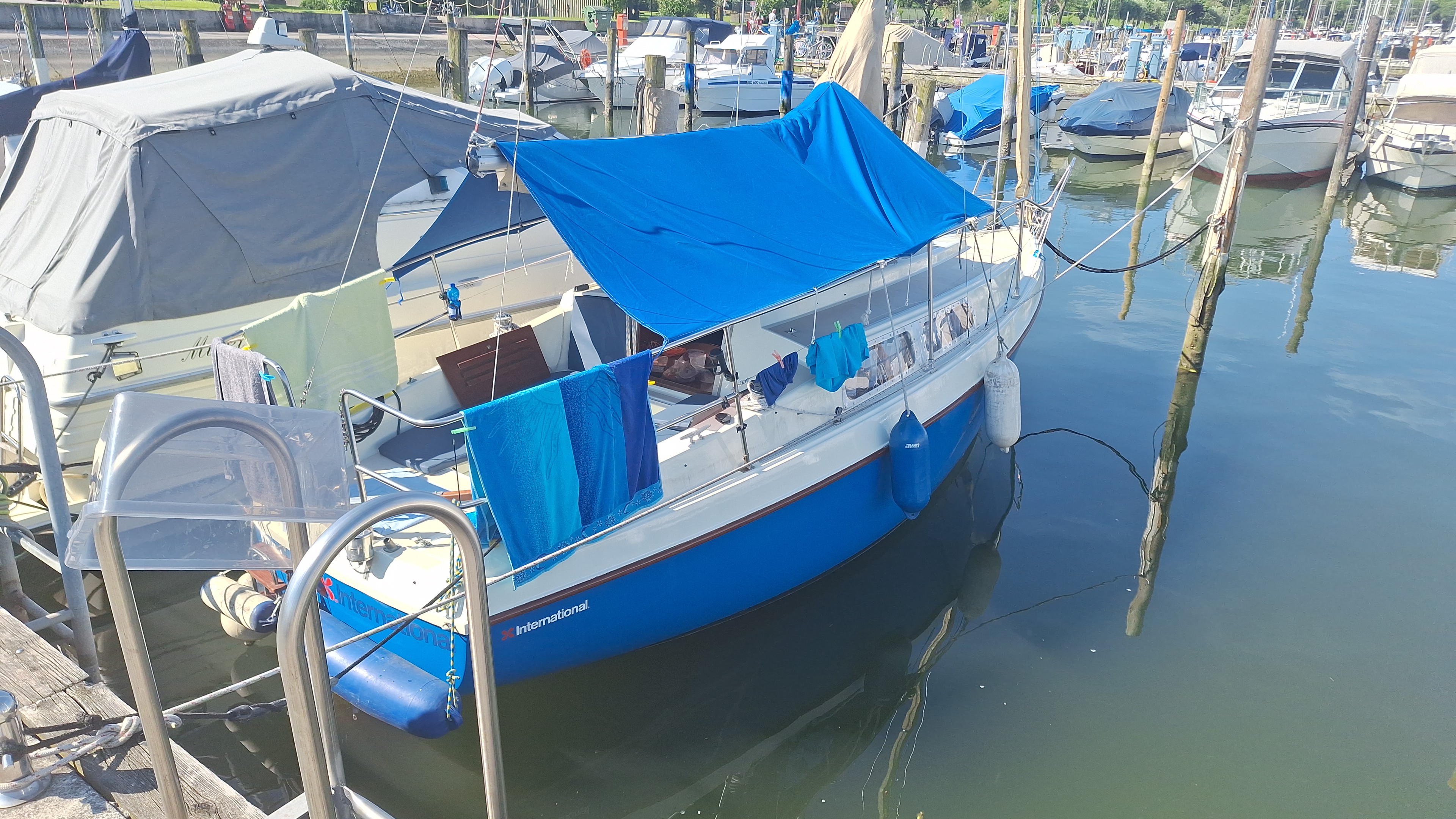 Zusätzlich enthalten sind eine komplette Kuchenbude sowie eine maßgeschneiderte Ganzpersenning, welche das Boot im Winter oder bei längerer Abwesenheit hervorragend schützt. Außerdem sind passende Persenninge für Großsegel und Vorsegel vorhanden.